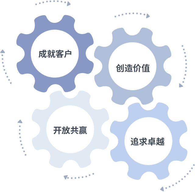 成就客户是一切决策的出发点,,,创造价值是衡量所有工作的标准,,追求卓越是我们做事做人的态度,,,,开放共赢是我们的格局也是最终的结果。。。价值观的齿轮环环相扣,,,,推动着组织里的每个人不断向前。。
