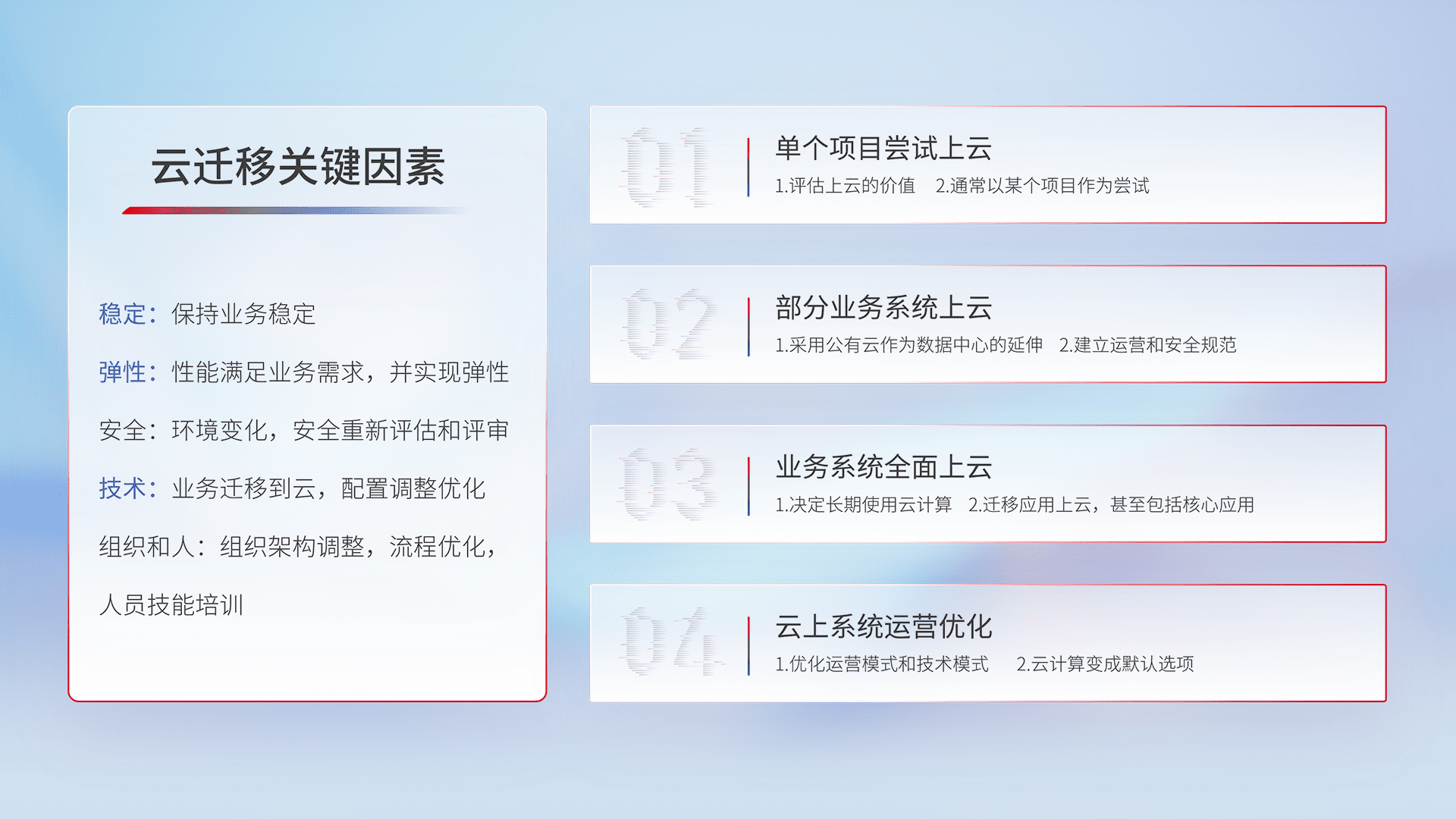 结合实际业务,,,,从规划设计、、云平台选型、、云原生改造、、、、数据迁移、、、集成交付,,迁移全过程为客户识别最佳上云路径,,做好风险识别管理,,,设计网络架构、、、身份权限、、、安全审计合规、、、、操作审计、、、、日志审计、、、、监控告警策略、、、多站点容灾设计等,,,,对云上基础设施进行整体规划,,,提升IT治理水平,,,以满足弹性、、、、高可用、、、高性能的需求。。